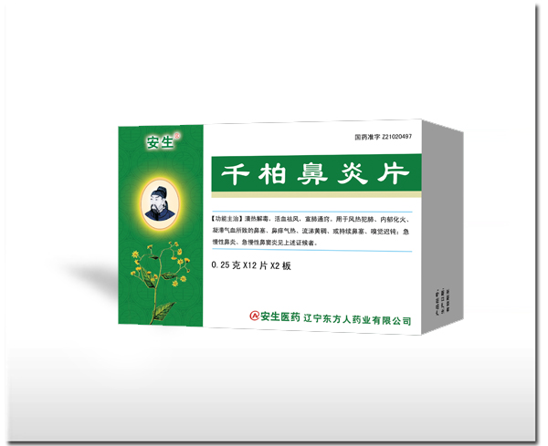 【药品名称】 通用名称:千柏鼻炎片 汉语拼音:Qianbai Biyan Pian 【成 份】千里光、卷柏、羌活、决明子、麻黄、川芎、白芷。 【性 状】本品为糖衣片,除去包衣后显棕褐色至棕黑色;味苦。 【功能主治】清热解毒,活血祛风,宣肺通窍。用于风热犯肺、内郁化火、凝滞气血所致的鼻塞、鼻痒气热、流涕黄稠、或持续鼻塞、嗅觉迟钝;急慢性鼻炎、急慢性鼻窦炎见上述证候者。 【规 格】每片重0.25克 【用法用量】口服。一次3~4片,一日3次。 【不良反应】尚不明确 【禁 忌】尚不明确 【注意事项】尚不明确 【贮 藏】密封。 【包 装】铝塑泡罩:每板10片×4板/小盒;每板12片×3板/小盒。 【有 效 期】36个月 【执行标准】《中国药典》2020版一部 【批准文号】国药准字 Z21020490 【药品上市许可持有人】辽宁东方人药业有限公司 【药品上市许可持有人地址】辽宁省本溪经济开发区医药园区 【生产企业】 企业名称:珠海安生医药有限公司 辽宁东方人药业有限公司 生产地址:辽宁省本溪经济开发区医药园区 邮政编码:117004 电话号码:024-45859555 传真号码:024-45859556 注册地址:辽宁省本溪经济开发区医药园