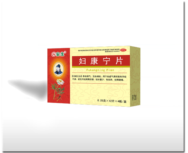 【药品名称】 通用名称:妇康宁片 汉语拼音:Fukangning Pian 【成 份】白芍、香附、当归、三七、醋艾炭、麦冬、党参、益母草。辅料为淀粉、蔗糖、滑石粉。 【性 状】本品为糖衣片,除去包衣后,显浅棕色至棕褐色;味微苦。 【功能主治】养血理气,活血调经。用于血虚气滞所致的月经不调,症见月经周期后错、经水量少、有血块、经期腹痛。 【规 格】片心重0.25克 【用法用量】口服,一次8片,一日2~3次;或经前4~5天服用。 【不良反应】尚不明确 【禁 忌】孕妇忌服。 【注意事项】1. 经期忌生冷饮食、不宜洗凉水澡。2. 痛经伴有其他疾病者,应在医师指导下服用。3. 服药后痛经不减轻,或重度痛经者,应到医院诊治。4. 服药时间:一般宜在月经来潮前4~5天开始,服至疼痛缓解。5. 如有生育要求(未避孕)宜经行当日开始服药。6. 按用法用量服用,长期应用应向医师咨询。7. 感冒时不宜服用本药。8. 对本品过敏者禁用,过敏体质者慎用。9. 本品性状发生改变时禁止使用。10. 儿童必须在成人监护下使用。11. 请将本品放在儿童不能接触的地方。12. 如正在使用其他药品,使用本品前请咨询医师或药师。 忌生冷食物,不宜洗凉水澡。 感冒发热病人不宜服用。 有高血压、心脏病、肝病、糖尿病、肾病等慢性病严重者应在医师指导下服用。 青春期少女及更年期妇女应在医师指导下服用。 平素月经正常,突然出现月经过少,或经期错后,或阴道不规则出血者应去医院就诊。 治疗痛经,宜在经前3~5天开始服药,连服1周。如有生育要求应在医师指导下服用。 服药后痛经不减轻,或重度痛经者,应去医院就诊。 治疗月经不调,服药1个月症状无缓解,应去医院就诊。 对本品过敏者禁用,过敏体质者慎用。 本品性状发生改变时禁止使用。 请将本品放在儿童不能接触的地方。 如正在使用其他药品,使用本品前请咨询医师或药师。 【药物相互作用】如与其他药物同时使用可能会发生药物相互作用,详情请咨询医师或药师。 【贮 藏】密封。 【包 装】铝塑泡罩:每板12片×4板/盒。 【有 效 期】 36个月 【执行标准】《中国药典》2020版一部 【批准文号】 国药准字Z21020833 【说明书修订日期】2020年12月30日 【药品上市许可持有人】辽宁东方人药业有限公司 【药品上市许可持有人地址】辽宁省本溪经济开发区医药园区 【生产企业】 企业名称:辽宁东方人药业有限公司 生产地址:辽宁省本溪经济开发区医药园区 邮政编码:117004 电话号码:024-45859555 传真号码:024-45859556