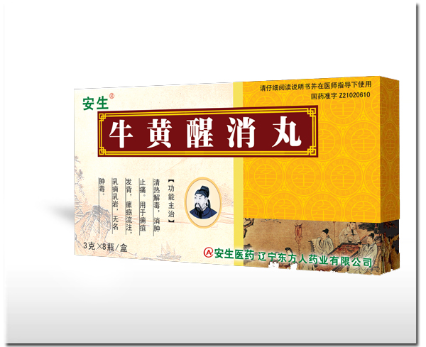 【药品名称】 通用名称:牛黄醒消丸 汉语拼音:Niuhuang Xingxiao Wan 【成 份】人工牛黄、人工麝香、乳香(制)、没药(制)、雄黄。 【性 状】本品为棕黄色至暗黄色的水丸;气芳香,味微苦。 【功能主治】清热解毒,消肿止痛。用于痈疽发背,瘰疬流注,乳痈乳岩,无名肿毒。 【规 格】每瓶装3克 【用法用量】用温黄酒或温开水送服,一次3克,一日1-2次;患在上部,临睡前服;患在下部,空腹时服。 【不良反应】尚不明确 【禁 忌】尚不明确 【注意事项】孕妇忌服。 【贮 藏】密闭,防潮。 【包 装】药用塑料瓶:每瓶装3克。 【有 效 期】36个月 【执行标准】部颁标准中药成方制剂第四册,标准编号:WS3-B-710-91 【批准文号】国药准字Z21020610 【药品上市许可持有人】辽宁东方人药业有限公司 【药品上市许可持有人地址】辽宁省本溪经济开发区医药园区 【生产企业】 企业名称:珠海安生医药有限公司 辽宁东方人药业有限公司 生产地址:辽宁省本溪经济开发区医药园区 邮政编码:117004 电话号码:024-45859555 传真号码:024-45859556 注册地址:辽宁省本溪经济开发区医药园区