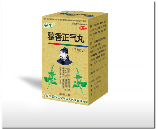 【药品名称】 通用名称:藿香正气丸(浓缩丸) 汉语拼音:Huoxiang Zhengqi Wan 【成 份】广藿香、紫苏叶、白芷、白术(炒)、陈皮、半夏(制)、厚朴(姜制)、茯苓、桔梗、甘草、大腹皮、大枣、生姜。 【性 状】本品为深棕色的浓缩丸;气芳香,味甘、微苦。 【功能主治】解表化湿,理气和中。用于暑湿感冒,头痛身重胸闷,或恶寒发热,脘腹胀痛,呕吐泄泻。 【规 格】每8丸相当于原生药3克 【用法用量】口服,一次8丸,一日3次。 【不良反应】尚不明确 【禁 忌】尚不明确 【注意事项】 饮食宜清淡。 不宜在服药期间同时服用滋补性中成药。 有高血压、心脏病、肝病、糖尿病、肾病等慢性病严重者、孕妇或正在接受其它治疗的患者,均应在医师指导下服用。 服药三天后症状未改善,或出现吐泻明显,并有其他严重症状时应去医院就诊。 按照用法用量服用,小儿、年老体虚者应在医师指导下服用。 长期服用应向医师咨询。 对本品过敏者禁用,过敏体质者慎用。 本品性状发生改变时禁止使用。 儿童必须在成人监护下使用。 请将本品放在儿童不能接触的地方。 如正在使用其他药品,使用本品前请咨询医师或药师。 【药物相互作用】如与其他药物同时使用可能会发生药物相互作用,详情请咨询医师或药师。 【贮 藏】密封。 【包 装】药用塑料瓶:每瓶装200丸。 【有 效 期】36个月 【执行标准】部颁标准中药成方制剂第七册,标准编号:WS3-B-1465-93 【批准文号】国药准字Z21020826 【说明书修订日期】2020年12月01日 【药品上市许可持有人】辽宁东方人药业有限公司 【药品上市许可持有人地址】辽宁省本溪经济开发区医药园区 【生产企业】 企业名称:珠海安生医药有限公司 辽宁东方人药业有限公司 生产地址:辽宁省本溪经济开发区医药园区 邮政编码:117004 电话号码:024-45859555 传真号码:024-45859556